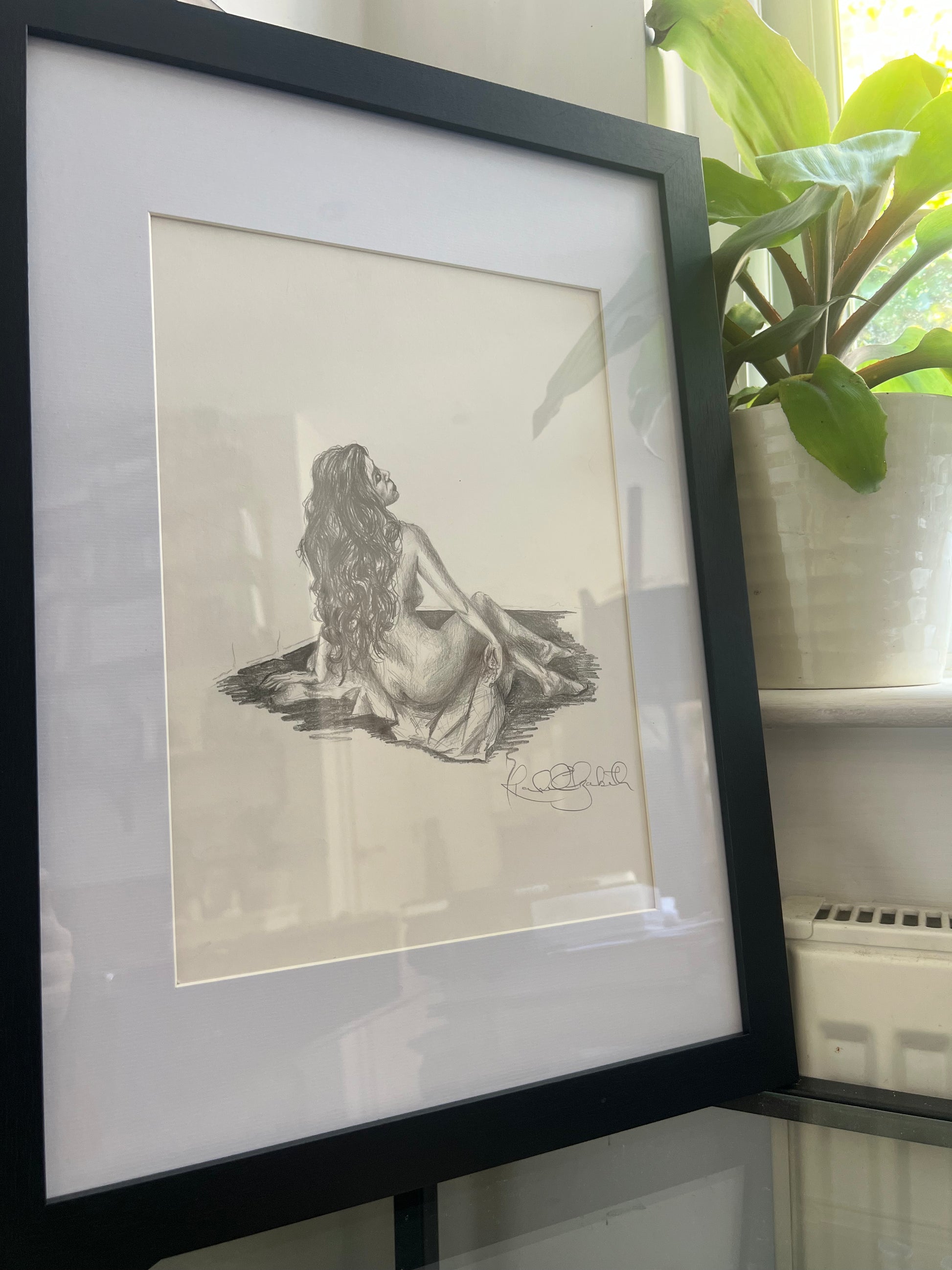 Original graphite pencil on paper. Inspired by vulnerability and feminine allure, "Beckoning" is an intricate pencil study of a muse, artist Jamie Beck, whose photography encourages a longing for the beauty of the views and vibrance of pretty Provence.