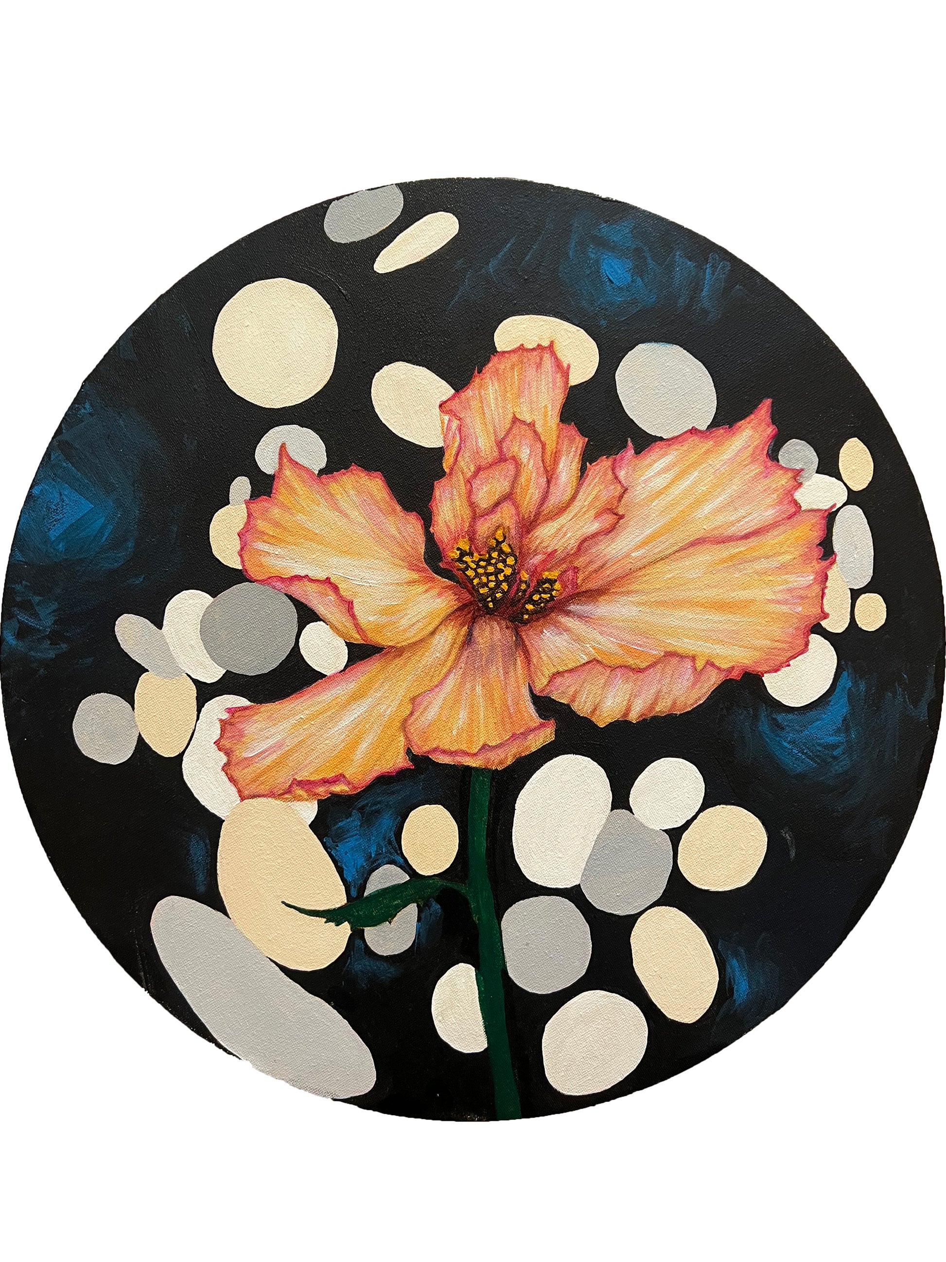 Original acrylic on circle canvas. Inspired by light orbs and the movement of nature, this painting of a Cosmos flower captures a moment of ethereal grace and magic, where light and nature dance together.
