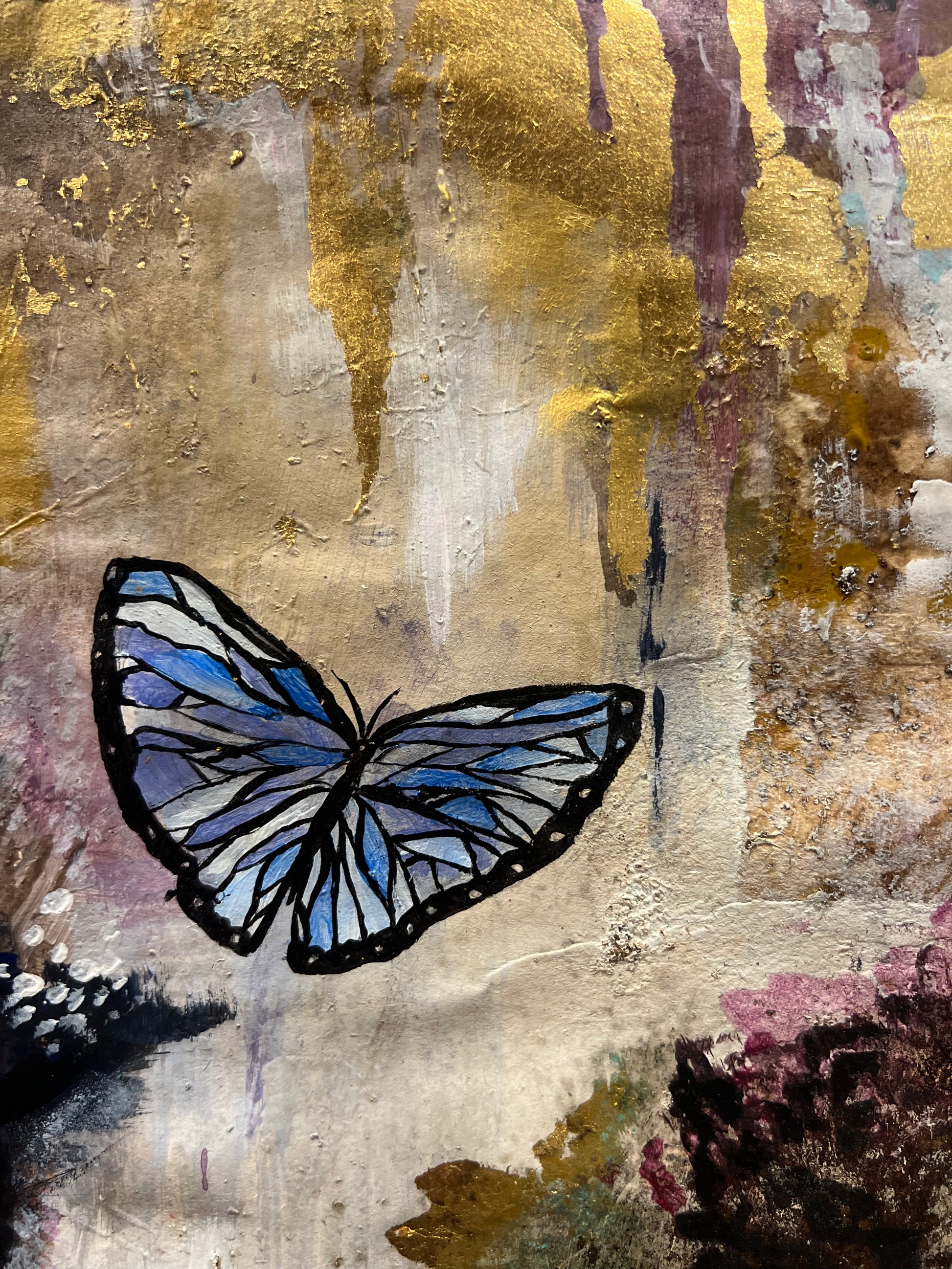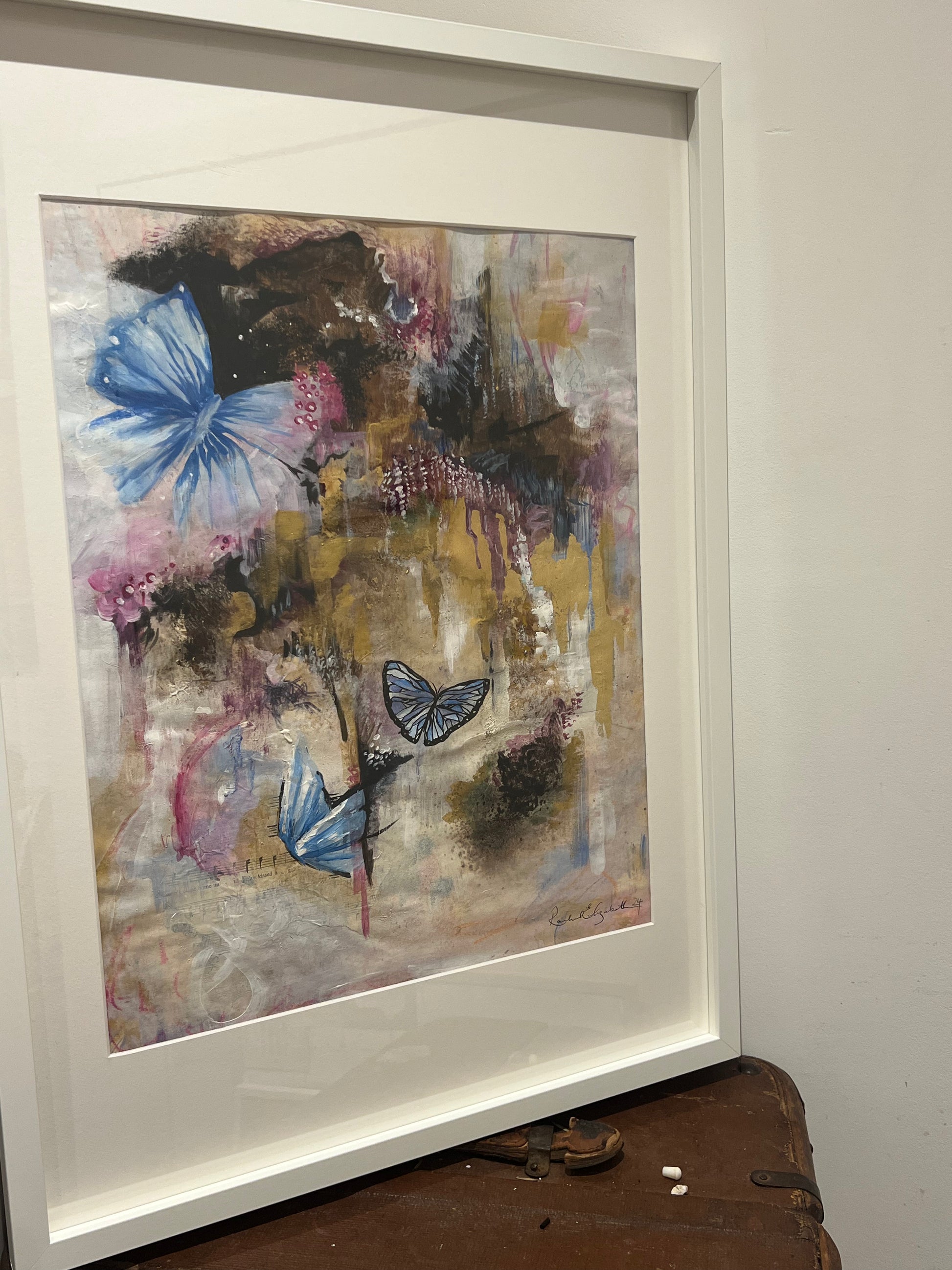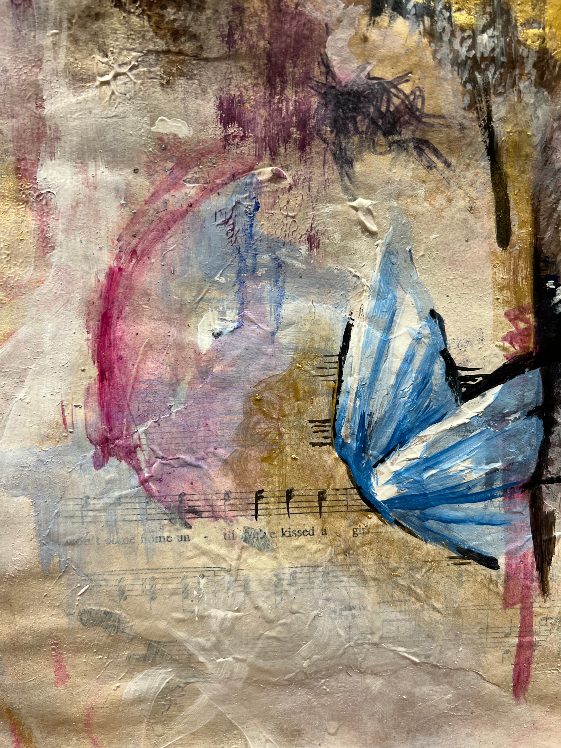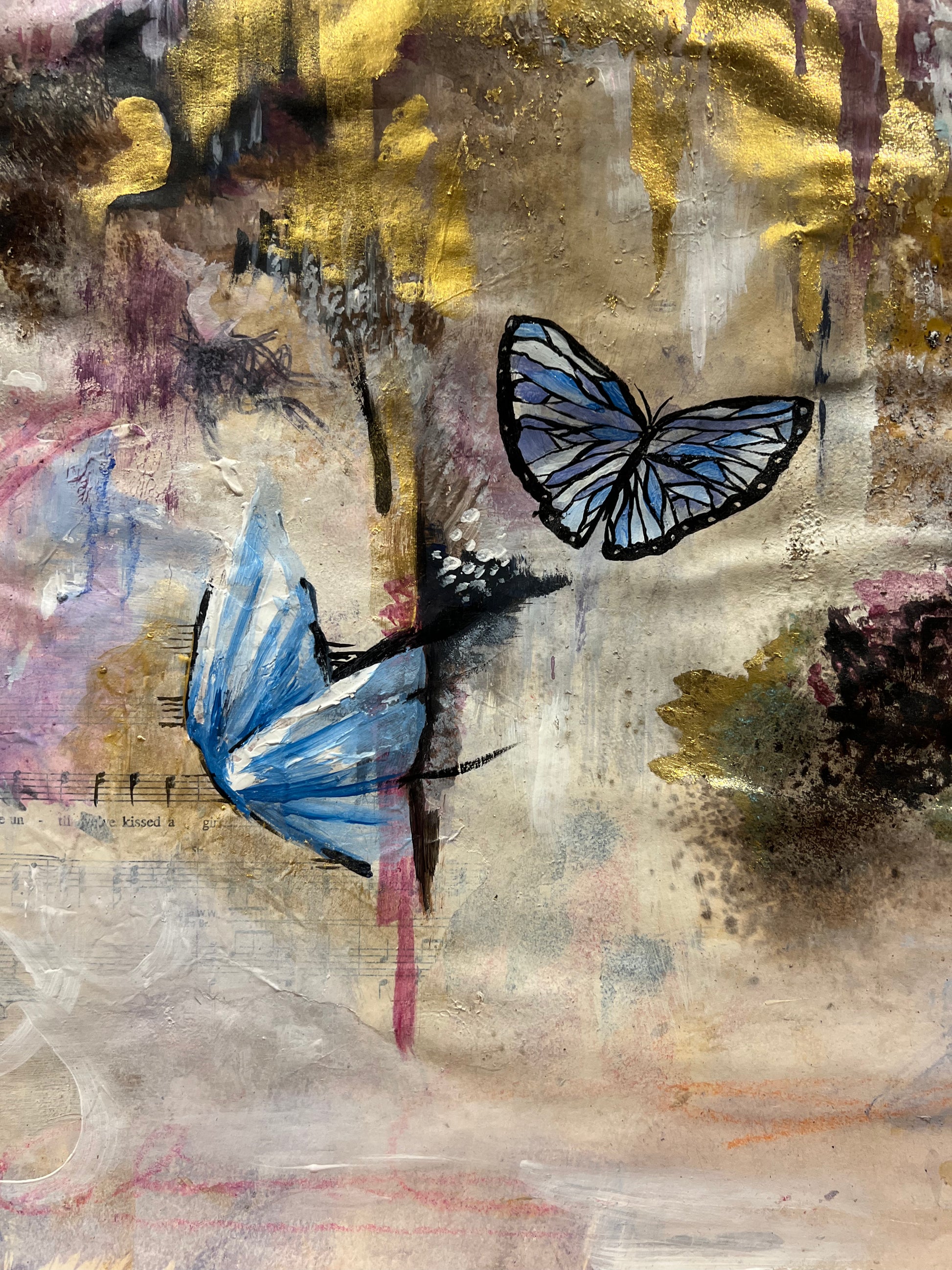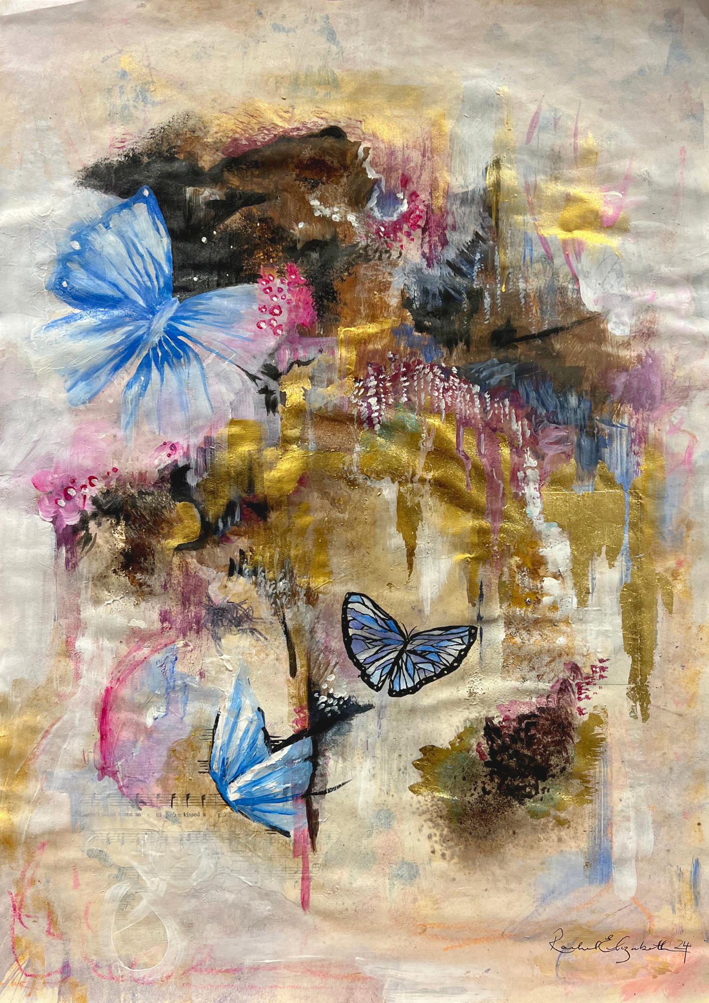 Original mixed media (collage, charcoal, coloured pencil, liquid marker pen, ink, acrylic and gold leaf) on paper. Inspired by the beauty and imperfection of nature, "Rapture" embodies a sense of melody, movement and metamorphosis in an abstract, dreamscape backdrop.